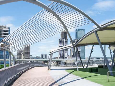 辰光橋作為專為行人及單車族駐足及通行之親水景觀橋,擁有空中景觀平台、景觀溪流、戲水地毯、綠化植栽等令人心曠神怡的設計,漫步橋上總讓人不禁駐足,感受風的流動與日月星辰的變化。天氣晴朗時,俯瞰綠意盎然的新北大都會公園;傍晚時分,讚嘆夕陽晚霞的燦爛唯美;到了華燈初上,不妨跟家人朋友一同欣賞月夜星辰的浪漫吧。